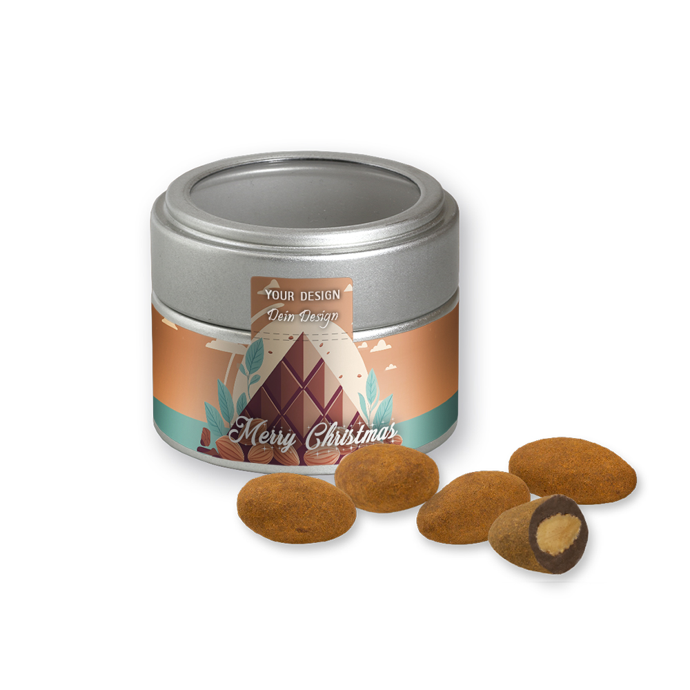 Schokomandeln mit Zimt, ca. 60g, Metalldose Mini mit Sichtfenster silber
