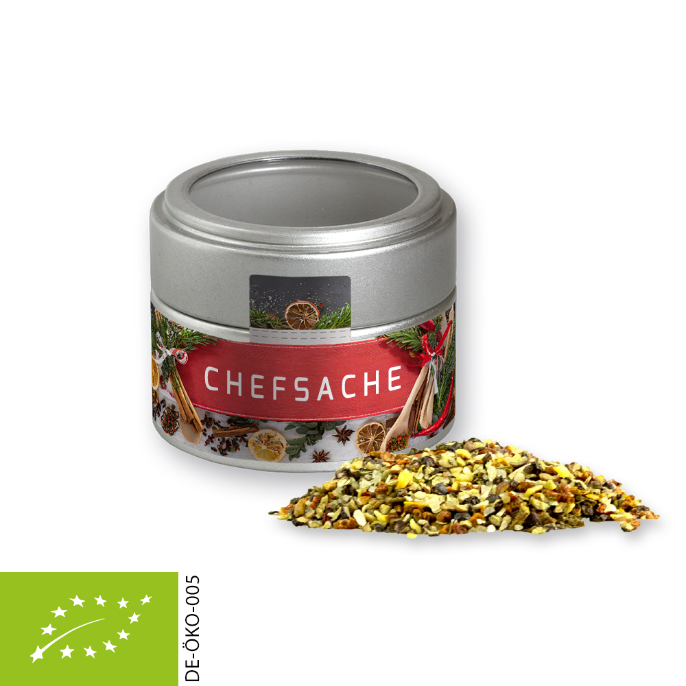 Bio Weihnachts Gewürzmischung Chefsache, ca. 50g, Metalldose Mini mit Sichtfenster silber