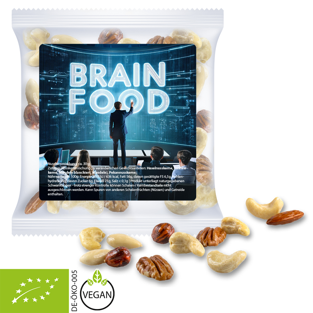 Unsere vielseitige Nusskernmischung überzeugt mit einer ausgewogenen Vielfalt aus knackigen Nüssen – ganz ohne Rosinen! Ideal für alle, die den puren Genuss von Mandeln, Cashews, Pekannüsse und Co. bevorzugen. Perfekt als nahrhafter Snack für unterwegs, im Büro oder einfach zwischendurch. Der NusskernMix eignet sich zudem hervorragend als hochwertiges Werbemittel. Mit Ihrem Firmenlogo oder Slogan bedruckt, wird die praktische Verpackung zum idealen Giveaway auf Messen, Firmenveranstaltungen oder als Teil eines Kundenpräsents. Zeigen Sie Geschmack und hinterlassen Sie einen bleibenden Eindruck!