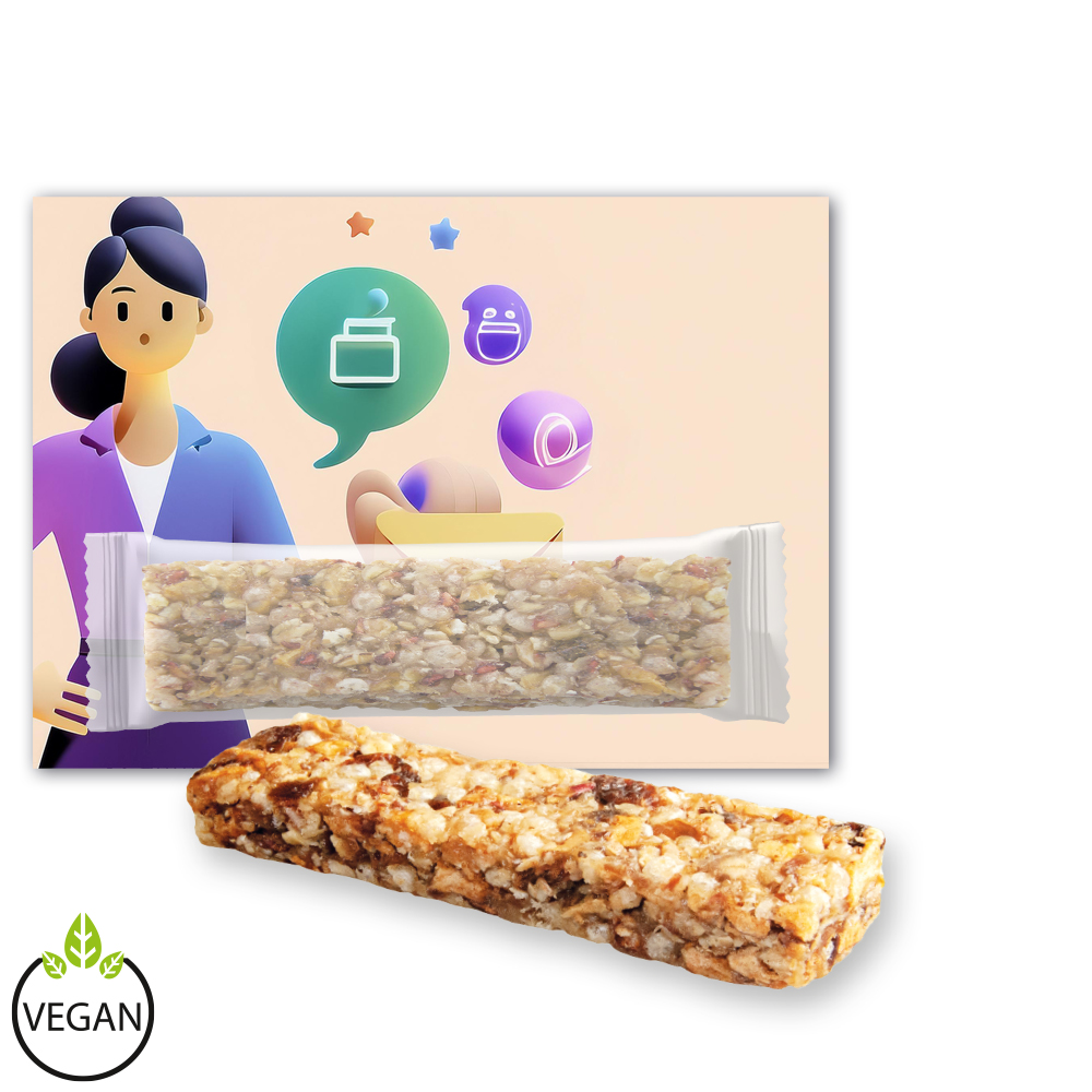 Mit dem Müsliriegel Multikorn-Apfel holen Sie sich den natürlichen Geschmack sonnengereifter Äpfel kombiniert mit nährstoffreichen Getreidesorten. Dieser vegane Riegel ist der perfekte Begleiter für aktive Tage und liefert eine ausgewogene Mischung aus Süße und Biss – ideal für unterwegs, im Büro oder als schneller Snack zwischendurch. Auch als Werbemittel überzeugt der Müsliriegel Multikorn-Apfel auf ganzer Linie. Mit Ihrem Logo bedruckt wird er zum erfrischenden Markenbotschafter, der mit Natürlichkeit und Qualität punktet. Ein Geschenk, das nicht nur Energie liefert, sondern auch positiv im Gedächtnis bleibt.